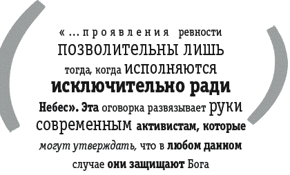 Оправдывая свои действия, экстремисты обычно ссылаются на Библию. Харедим участвуют в актах запугивания, иногда со стороны агрессивной толпы, против нерелигиозных евреев, они бросают камни в машины, которые ездят по субботам, и избивают их водителей. Эти радикалы ссылаются на пример Финееса, который также, увидев кощунственные действия, несущие угрозу всему народу, здесь же ответил на это действием. Такие ссылки на пример Финееса повторяют рассуждения рава Кука. Один из его современных поклонников сказал: «Рав Кук объяснял, что Тора обычно не одобряет подобные проявления ревности. Они позволительны лишь тогда, когда исполняются исключительно ради Небес». Разумеется, эта оговорка развязывает руки современным активистам, которые могут утверждать, что в любом данном случае они защищают Бога{270}.