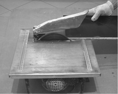 Конструкция электрического плиткореза достаточно проста. В нее обязательно входят платформа, на которой закрепляется режущий диск с алмазным покрытием, и поддон с водой. Скорость резки примерно такая же, как и при распиливании бревна бензопилой, только в этом случае вам приходится двигать плитку к ножу, а не наоборот (рис. 2.45).