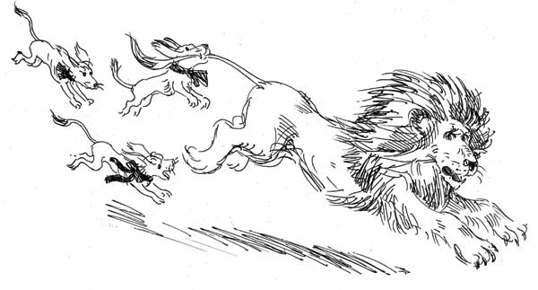 Пять крошечных собачонок бросились на огромного льва. Они были такие маленькие, что лев одним ударом своей большущей лапы мог убить сразу трёх таких собачонок, а двумя ударами их всех и ещё одну.