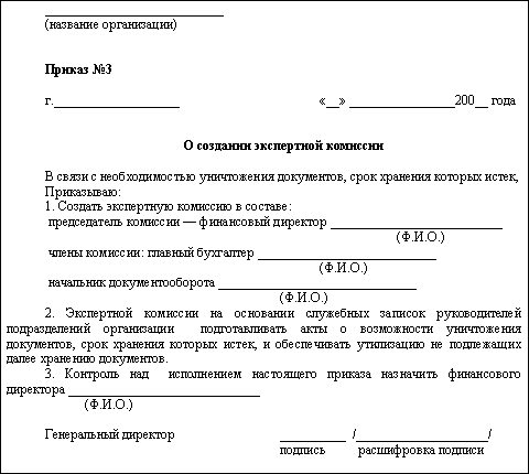 Счета-фактуры с истекшим сроком хранения можно уничтожить. Прежде всего руководитель организации, в которой имеется архив, должен назначить приказом экспертную комиссию в составе не менее 3 человек. Такие рекомендации даются в Основных правилах работы архивов организаций, одобренных решением Коллегии Росархива от 06.02.2002 г. В ее состав обычно включается работник архива и руководитель того подразделения, чьи документы подлежат уничтожению, а также руководящий работник организации, в чьем подчинении находится архивный