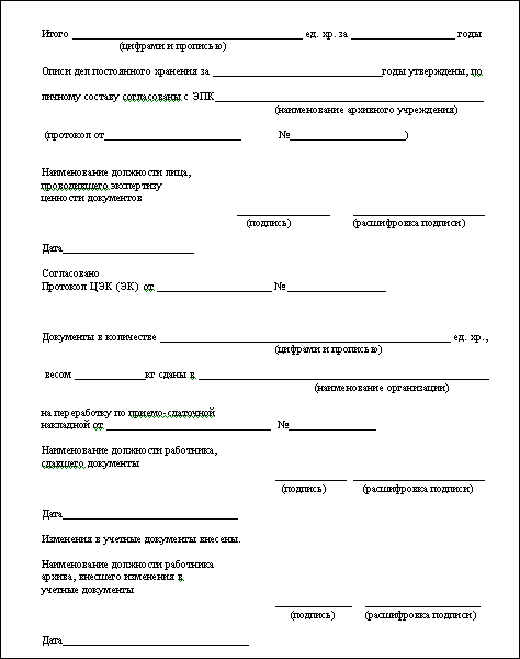 Экспертная комиссия на основании служебных записок руководителей подразделений, например, главного бухгалтера об уведомлении истечения срока хранения по счетам-фактурам за 2001 г. с приложением списка дел в разрезе наименования документов, количества дел, года завершения в делопроизводстве и срока хранения по номенклатуре дел, может составить акт в данном случае с датой не ранее 1 января 2006 г. На основании служебной записки экспертная комиссия принимает решение, фиксируемое в протоколе, о подготовке акта о выделении к уничтожению документов, срок хранения которых истек.