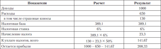 Самые главные достоинства этого вида УСН заключаются в предельной простоте уплаты налога и в отсутствии какой-либо отчетности по этому налогу вообще. Однако если предприниматель привлекает наемных работников, то ему придется отчитываться перед налоговым органом по НДФЛ о выплаченных работникам доходах и перед социальными фондами по страховым взносам. Подробности этих процедур будут освещаться в гл. 5 и 6. А пока мы вернемся к нашему примеру с автосервисом, но несколько изменим входные данные: ведь он может работать и в статусе индивидуального предпринимателя с количеством работников не более 5 человек. С учетом того, что предприниматель должен платить страховые взносы не только за своих работников, но и за себя, увеличим эту статью на 34 % от 12 МРОТ, что составляет 34 % х 12 х 4330 = 17,66 тыс. руб.