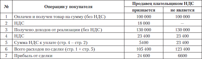 Как видно из табл. 2.1, при покупке у «упрощенца» прибыль от сделки уменьшается почти вчетверо за счет отсутствия вычета НДС, и в таком виде продавцам без НДС действительно будет гораздо труднее продать свои товары.
