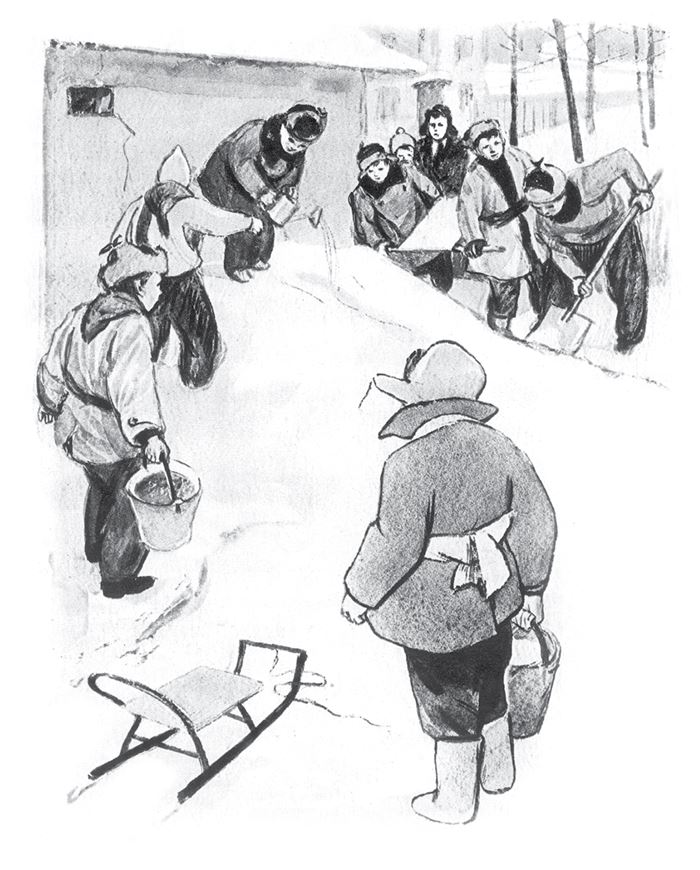 Котька стал посыпать горку снегом, а ребята снова водой полили.