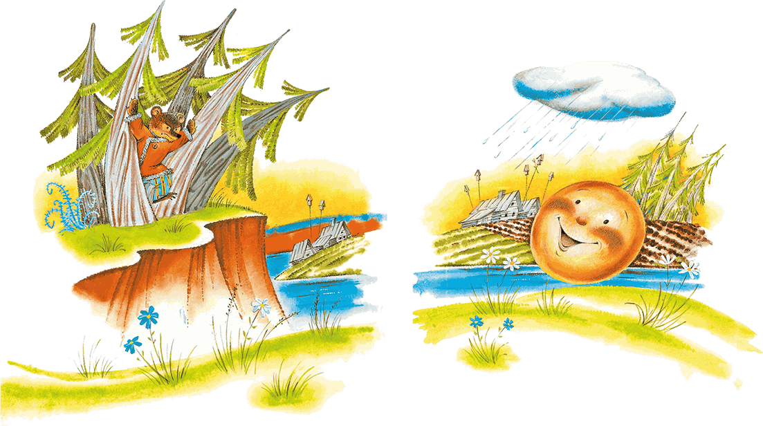 Катится колобок по лесу, а навстречу ему медведь идёт, хворост ломает, кусты к земле гнёт: