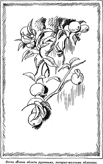 ЭТЮД ВТОРОЙ. Знойный июльский полдень. Солнце в зените. Ни дуновения ветра, ни колыхнется листок. В колхозном фруктовом саду ветви яблонь облиты румяными, янтарно-желтыми, бледно-зелеными с красными прожилками яблоками. Ветви яблонь клонятся книзу; если бы не подпорки, не удержать буйное богатство плодов. Сторож, статный старик в ярко-синей рубахе, тряхнул одну ветвь, и спелые яблоки попадали и цветисто усыпали землю. Малыши в пестрых рубашонках и платьицах подбирают яблоки.