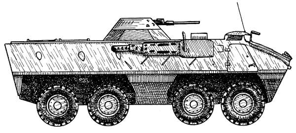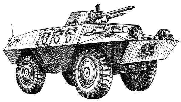 Колесный бронетранспортер М706 «Коммандо» (рис. 43 ) поступал в американские войска в трех модификациях (V-100, V-150, V-200). Они отличались друг от друга силовыми установками (на двух последних стояли дизельные двигатели) и бронированием. V-200, помимо этого, обладает еще и большими габаритами. На разных моделях БТР может быть установлено разное пушечно-пулеметное вооружение.