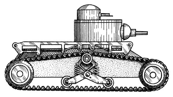 В 1932 году пехота выступила с заказом на пять дополнительных машин, но к этому времени взаимоотношения Кристи с департаментом вооружений окончательно испортились. Началось с того, что департамент игнорировал его безбашенную модель М.1932 (рис. 96 ), выполненную из дюралюминия и стали с применением сварки и рассчитанную на экипаж из 3 человек. Боевая масса этой машины составляла 4,5…5 тонн, мощность двигателя 760 л. с., максимальная скорость 96 км/ч (на гусеницах) и 193 км/ч (на колесах). Ее размеры: 6,6 x 2,13 x 1,73 м.