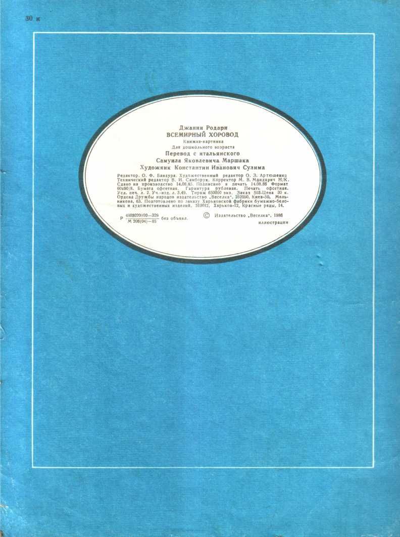 Редактор. О. Ф. Бандура. Художественный редактор О. 3. Артюшенко Технический редактор В. И. Самборук. Корректор М. В. Мандарич Н/К. Сдано на производство 14.08.85. Подписано в печать 14.08.86 Формат 60x90/8. Бумага офсетная. Гарнитура рубленая. Печать офсетная. Усл. печ. л. 2. Уч.-изд. л. 3,49. Тираж 650000 экз. Заказ 503. Цена 30 к. Ордена Дружбы народов издательство „Веселка“, 252050, Киев-50, Мельникова, 63. Подготовлено по заказу Харьковской фабрики бумажно-беловых и художественных изделий, 310012, Харьков-12, Красные ряды, 14.