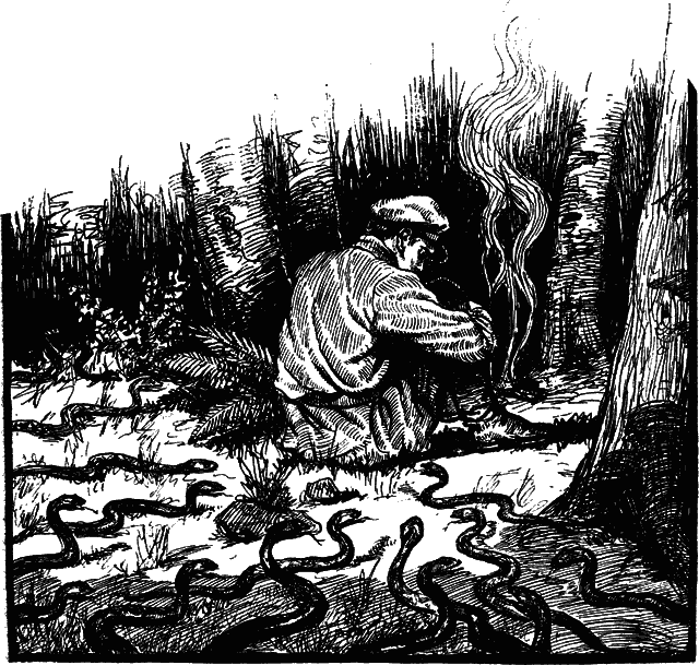 Между тем короткая летняя ночь приближалась к концу, и восток уже начал покрываться розоватым утренним блеском. Через некоторое время совершенно рассвело, и студент спрыгнул с дерева и приступил к своему опасному занятию. Это была жуткая картина, когда испуганные гады с шипеньем ползли в разные стороны.