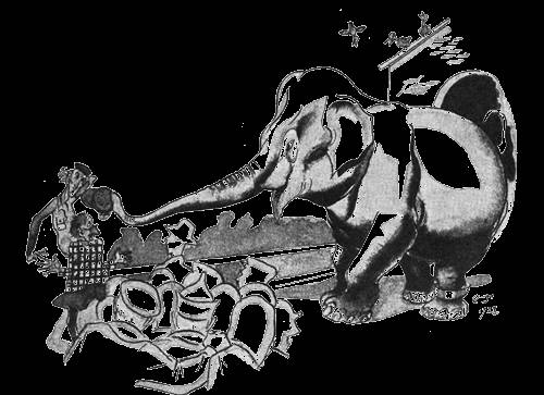 Публика громко ахнула, а Семен Семеныч… недаром он целый год состоял в обществе физкультуры — в мгновение ока преодолел высокую загородку и очутился в самой клетке слона. Держась одной
