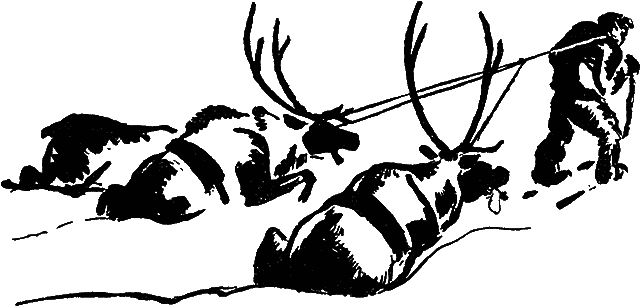 Лес был густой. Деревья стояли так тесно, что часто сани задевали за них. Удивительно, как бережно обращаются олени со своими рогами. Проходя под деревом, они не заденут ими ни за одну ветку и при этом очень изящно наклоняют и поворачивают голову.