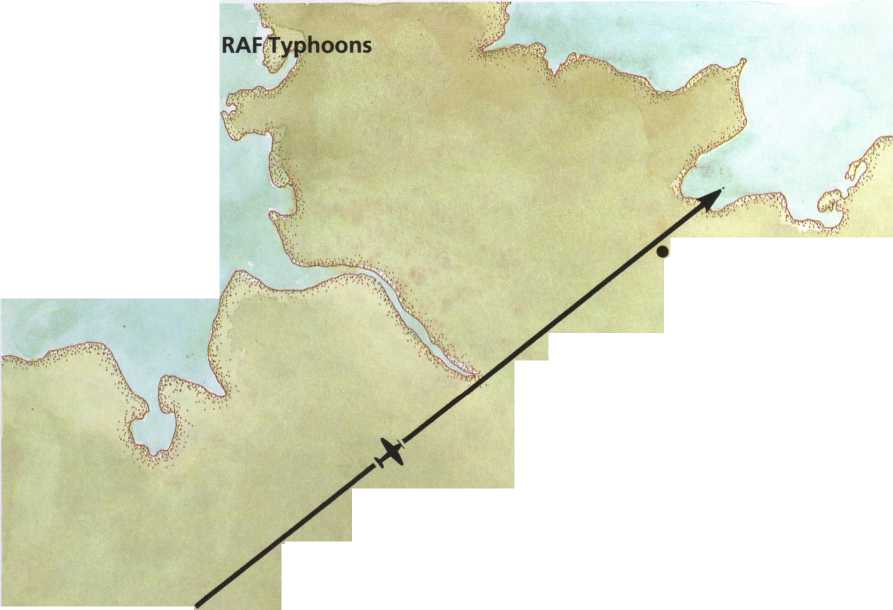 После полудня 3 мая погода прояснилась, и я тактическая воздушная армия бросила в бой кадрильи “тайфунов” в Любекском заливе, где «душная разведка обнаружила несколько эупных судов. Выполнение этого задания было вручено четырем эскадрильям авиакрыла № !3. Эскадрильи № 184, 263 и 198 были воору-ены пушками и ракетами, а эскадрилья № 197 хла пушки и бомбы.