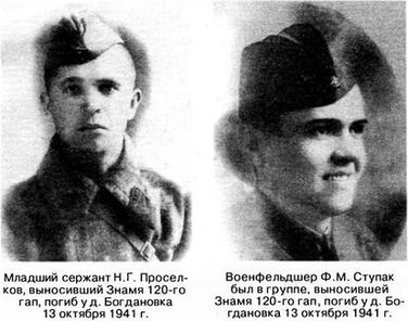 В найденном захоронении, кроме останков Ступака, находились останки неизвестного майора (многое говорит, что это был батальонный комиссар Г.А. РУСАКОВ), неизвестного офицера и еще одного медика, опознать которого не удалось, а также рядового Рубцова А.П. и писаря штаба полка младшего сержанта Н.Г. Проселкова. В одном из писем Николай спросил меня, что за шевроны могли быть на военном обмундировании. И только потом выяснилось, что речь шла о какой-то ткани, сложенной в несколько слоев, с остатками золотистого шеврона, найденной им на груди сержанта Проселкова под шинелью. При повторном осмотре предметов, найденных в захоронении уже с моим участием, выяснилось, что ткань от соприкосновения с воздухом вся рассыпалась. Вне всякого сомнения, именно писарю штаба члену партии Н.Г. Проселкову, который до призыва в армию был парторгом шахты, было поручено вынести святыню — Знамя полка. И его сопровождала группа специально назначенных бойцов, с которой, возможно, следовал и комиссар полка. Недалеко от этого места местные жители обнаружили командира, который нес портфель, полный денег в запечатанных пачках (очевидно, часть полковой кассы).
