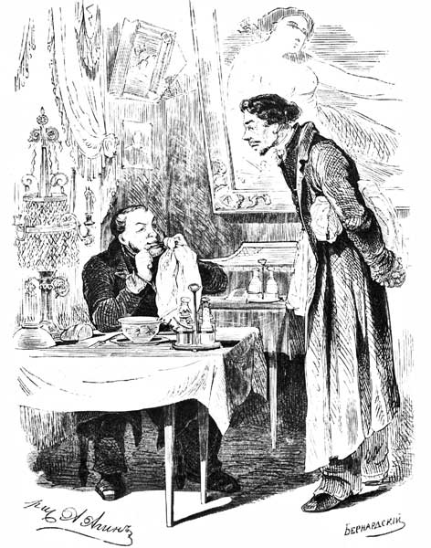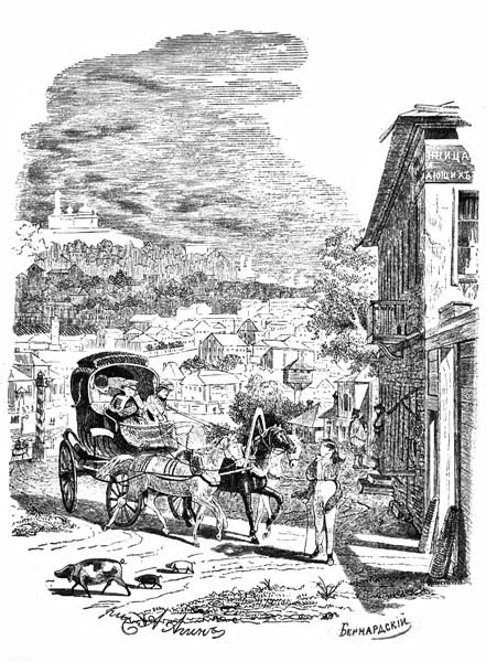 Когда экипаж въехал на двор, господин был встречен трактирным слугою, или половым, как их называют в русских трактирах, живым и вертлявым до такой степени, что даже нельзя было рассмотреть, какое у него было лицо. Он выбежал проворно с салфеткой в руке, весь длинный и в длинном демикотонном сюртуке со спинкою чуть не на самом затылке, встряхнул волосами и повел проворно господина вверх по всей деревянной галерее показывать ниспосланный ему богом покой. — Покой был известного рода; ибо гостиница была тоже известного рода, то есть именно такая, как бывают гостиницы в губернских городах, где за два рубля в сутки проезжающие получают покойную комнату с тараканами, выглядывающими, как чернослив, из всех углов, и дверью в соседнее помещение, всегда заставленною комодом, где устраивается сосед, молчаливый и спокойный человек, но чрезвычайно любопытный, интересующийся знать о всех подробностях проезжающего. Наружный фасад гостиницы отвечал ее внутренности: она была очень длинна, в два этажа; нижний не был отштукатурены и оставался в темно-красных кирпичиках, еще более потемневших от лихих погодных перемен и грязноватых уже самих по себе; верхний был выкрашен вечною желтою краскою; внизу были лавочки с хомутами, веревками и баранками. В угловой из этих лавочек, или, лучше, в окне, помещался сбитенщик с самоваром из красной меди и лицом так же красным, как самовар, так что издали можно бы подумать, что на окне стояло два самовара, если б один самовар не был с черною, как смоль, бородою.
