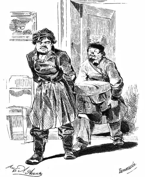 Пока приезжий господин осматривал свою комнату, внесены были его пожитки: прежде всего чемодан из белой кожи, несколько поистасканный, показывавший, что был не в первый раз в дороге. Чемодан внесли кучер Селифан, низенькой человек в тулупчике, и лакей Петрушка, малый лет тридцати, в просторном подержанном сюртуке, как видно с барского плеча, малый немного суровый на взгляд, с очень крупными губами и носом. Вслед за чемоданом внесен был небольшой ларчик красного дерева, с штучными выкладками из карельской березы, сапожные колодки и завернутая в синюю бумагу жареная курица. Когда всё это было внесено, кучер Селифан отправился на конюшню возиться около лошадей, а лакей Петрушка стал устраиваться в маленькой передней, очень темной конурке, куда уже успел притащить свою шинель и вместе с нею какой-то свой собственный запах, который был сообщен и принесенному вслед за тем мешку с разным лакейским туалетом. В этой конурке он приладил к стене