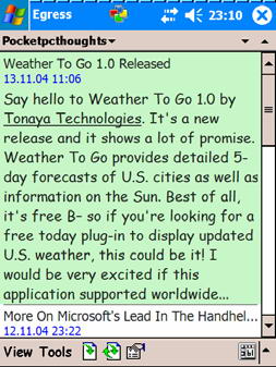 И все же есть тройка программ, украшающая и эту слабосильную группу. Во-первых, отличный порт Skype для Pocket PC – блестящий клиент IP-телефонии (о нем была «Голубятня» в этом году). Во-вторых, Egress – безусловно лучшая программа для работы с модными сегодня RSS-каналами. В-третьих, клиент FTP – встроенный в Resco File Explorer (о нем я рассказал в четвертой Саге):