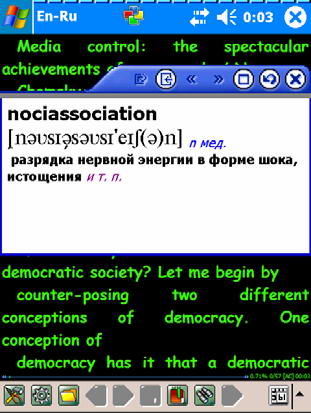 Идеальное воспроизведение текста на экране – не просто любой шрифт и любой фон, но и совершенное форматирование: никаких тебе оборванных посредине строк, никаких зияния. Поддержка множества словарей (хочешь, встроенные, собственного формата, хочешь парагоновский SlovoED, хочешь Lingvo), причем словарь запускается одним прикосновением стилуса к нужному слову (см. скриншот). Полная поддержка VGA (обратите внимание на прорисовку кнопок на скриншоте!), молниеносная загрузка в память текста любого размера, наконец, умение читать множество форматом, в том числе и файлы в компрессированном виде (zip). Добавьте сюда собственный формат fb2, созданный на основе xml и поддерживающий воспроизведение картинок, и вы получите подлинную perfectia in prefectis: