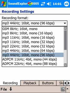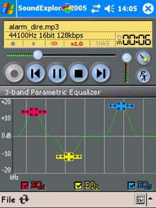 SoundExplorerподдерживает форматы MP3, Wave (включая GSMи ADPCM), OGG, WMA, конвертирует Wave в MP3, записывает на уровне CD-качества 44100 Hz stereo (чего не может даже самый продвинутый конкурент – Resco Audio Recorder), имеет встроенный трех полосный параметрический эквалайзер, а также регулятор скорости воспроизведения дорожке – господи, неужели такие возможности сегодня доступны на маленьком наладоннике?