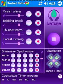 Еще одна программа, связанная со звуком – Рocket Natura Sound Therapy от Optical Sweets. Когда-то давно выходила Голубятня об одноименном генераторе мозговых волн (альфы - для расслабления и творческого заряда, беты – для концентрации и фокусировки внимания, дельты - для стимуляции глубокого сна и теты - для медитации и обучения) для настольного компьютера. Так вот: Pocket Natura – это удачный порт для вашего наладонника: