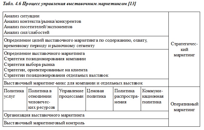 Как следует из таблицы, стратегический выставочный маркетинг стремится к долгосрочному позиционированию выставочной компании относительно своих клиентов и конкурентов. Ключевые подходы здесь — стратегический анализ ситуации на рынке и определение маркетинговых целей и стратегий. Оперативный маркетинг занят определением инструментов маркетинга, применяемых к отдельным выставкам, в соответствии со стратегической ориентацией компании и позиционированием на целевом рынке. Результатом маркетинга является маркетинговый план.