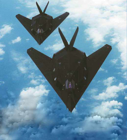 Ну а основную долю в деле снижения ЭОП, составляющую около 90%, вносили так называемые «фасеточные формы», реализованные в архитектуре нового «чудо-самолета». Здесь все очень просто – наклонные поверхности планера отражают радиолокационные лучи вражеского радара куда угодно, но только не в обратном направлении на приемную антенную радиолокационной станции. Все щели и сочленения элементов конструкции имели накладки с пилообразной кромкой, аналогичные кромки получили и створки отсеков шасси, двигателей и вооружения. При этом было предусмотрено – ни один из секторов интенсивного отражения не должен быть направлен непосредственно вперед. А отражения от острых кромок корпуса и мест нарушения непрерывности обшивки были сконцентрированы лишь в нескольких узких секторах и распределены весьма неравномерно – аппаратура радара просто не в состоянии отличить эти отражения от фонового шума и не может извлечь из них полезной информации. Это и позволяло бы достигать эффекта «невидимости».