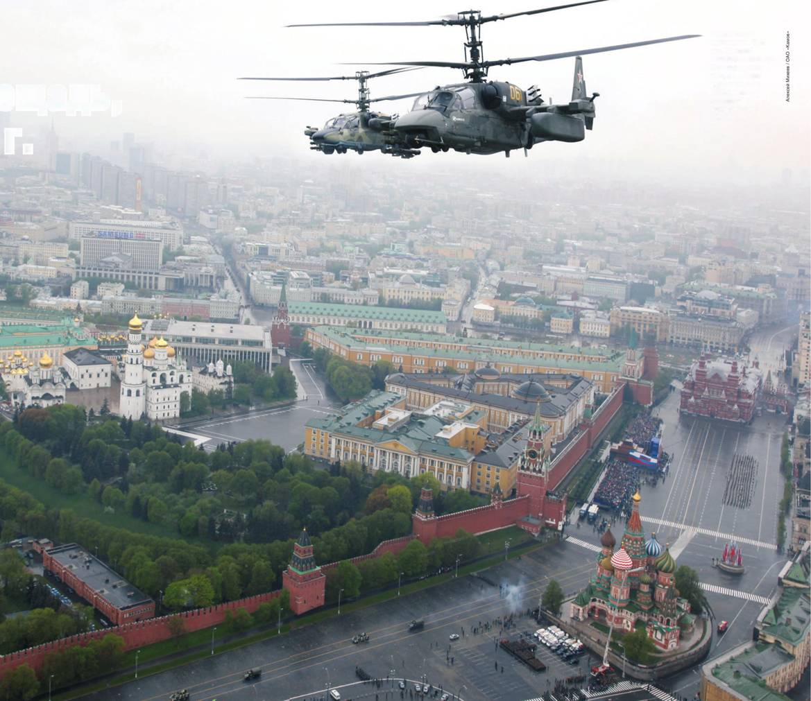 Пара боевых вертолетов Ка-52 над Красной площадью Москвы. Снимок сделан с борта лидера группы из пяти вертолетов – тяжелого транспортного Ми-26