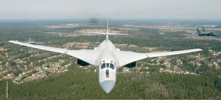 Стратегический ракетоносец-бомбардировщик Ту-160 в сопровождении группы истребителей- перехватчиков МиГ-31. Снимок сделан во время подготовки к Параду Победы в небе Подмосковья с борта самолета-заправщика Ил-78