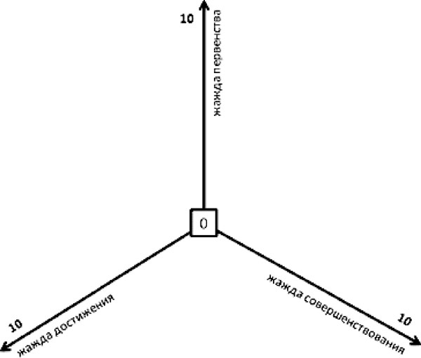 Чтобы было проще, предлагаем воспользоваться следующей схемой. На ней вы видите трехвекторную систему. На каждой оси по 10-балльной шкале оцените степень выраженности у вас того или иного качества. Соедините крайние точки.