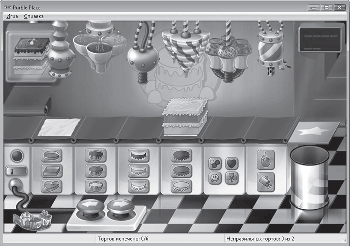 • Purble Place. Красочно оформленная игра предназначена для развития памяти и логики у малышей. Они могут выполнять три типа заданий: открывать картинки и собирать их попарно, печь торт по заказу (рис. 4.18) и моделировать лицо человечка.