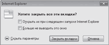 При попытке закрыть окно Internet Explorer, содержащее несколько вкладок, появится предупреждающее окно. Щелкнув в нем кнопкой мыши на ссылке Показать параметры, вы развернете окно с параметрами, которые отвечают за дальнейшие действия с вкладками (рис. 5.7).
