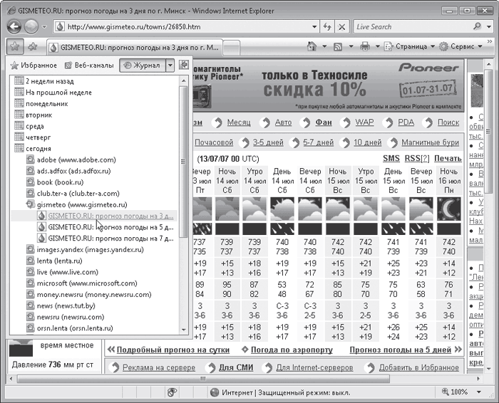 Использование Журнала удобно, если вы помните, что «в среду заходил на какой-то прикольный сайт, но вот на какой?». В этой непростой ситуации достаточно открыть Журнал, щелкнуть кнопкой мыши на слове Среда и в раскрывшемся списке поискать название сайта, которое покажется вам «тем самым».
