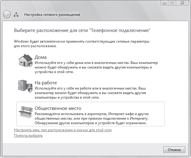 Далее произойдет автоматическое обнаружение сети и подключение к ней компьютера. Об этом вас уведомит появление окна, изображенного на рис. 4.5. В нем вам предстоит выбрать местоположение компьютера для данной сети. При выборе пунктов Дома или На работе будет включено сетевое обнаружение.