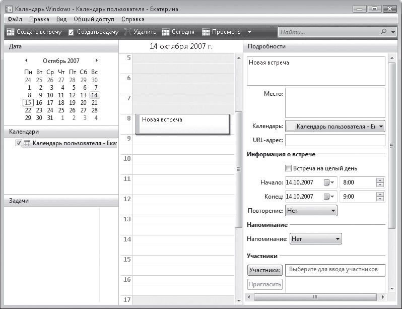 • События. Эта центральная область окна предназначена для планирования встреч и других мероприятий. По умолчанию здесь отображается текущий день в почасовом представлении. Графа каждого часа разделена на две части, что позволяет отметить событие минимальной длительностью в полчаса. Чтобы задать новую встречу или другое мероприятие, выделите с помощью мыши графы, соответствующие тому количеству времени, которое нужно отвести на событие, и нажмите кнопку Создать встречу, в появившейся зеленой табличке пометьте для себя основные моменты мероприятия.
