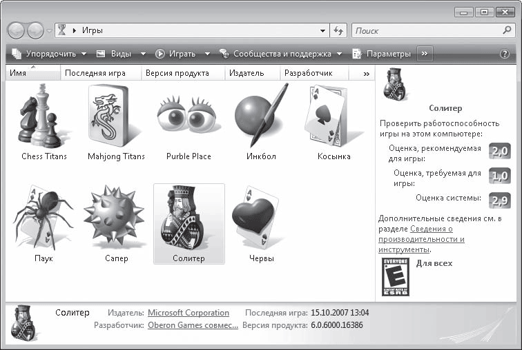Многие пользователи, делая перерыв в работе, с удовольствием посвящают его игре на компьютере. Предыдущие версии Windows не отличались большим разнообразием встроенных развлечений: скрасить досуг могли лишь несколько карточных игр и Сапер, в котором предлагалось «пройтись» по полю, не «наступив» на мину. Сейчас ситуация изменилась. В меню Пуск расположен ярлык Игры, с помощью которого можно открыть Обозреватель игр (рис. 5.22) и убедиться в том, что в Windows Vista помимо уже знакомых присутствуют и новые виды развлечений.