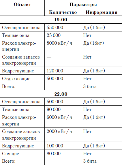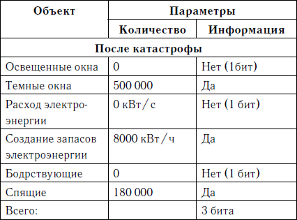 Из таблицы видно, что, наблюдая за населенным пунктом в разное время суток до катастрофы и после нее, без труда можно обнаружить изменения, но машина, запрограммированная на восприятие определенной информации, получает ответы на те же вопросы, количество информации при этом сохраняется. Это закон сохранения информации.