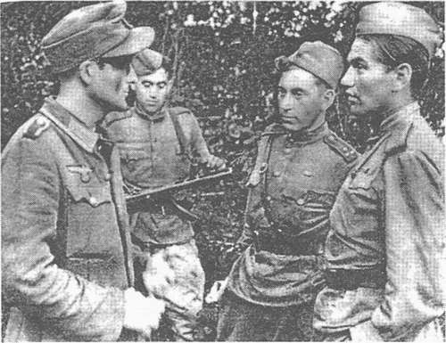 Разведчики допрашивают немца. Рядом с «языком» стоят разведчик Яскевич, лейтенант Акерман и переводчик Пактор