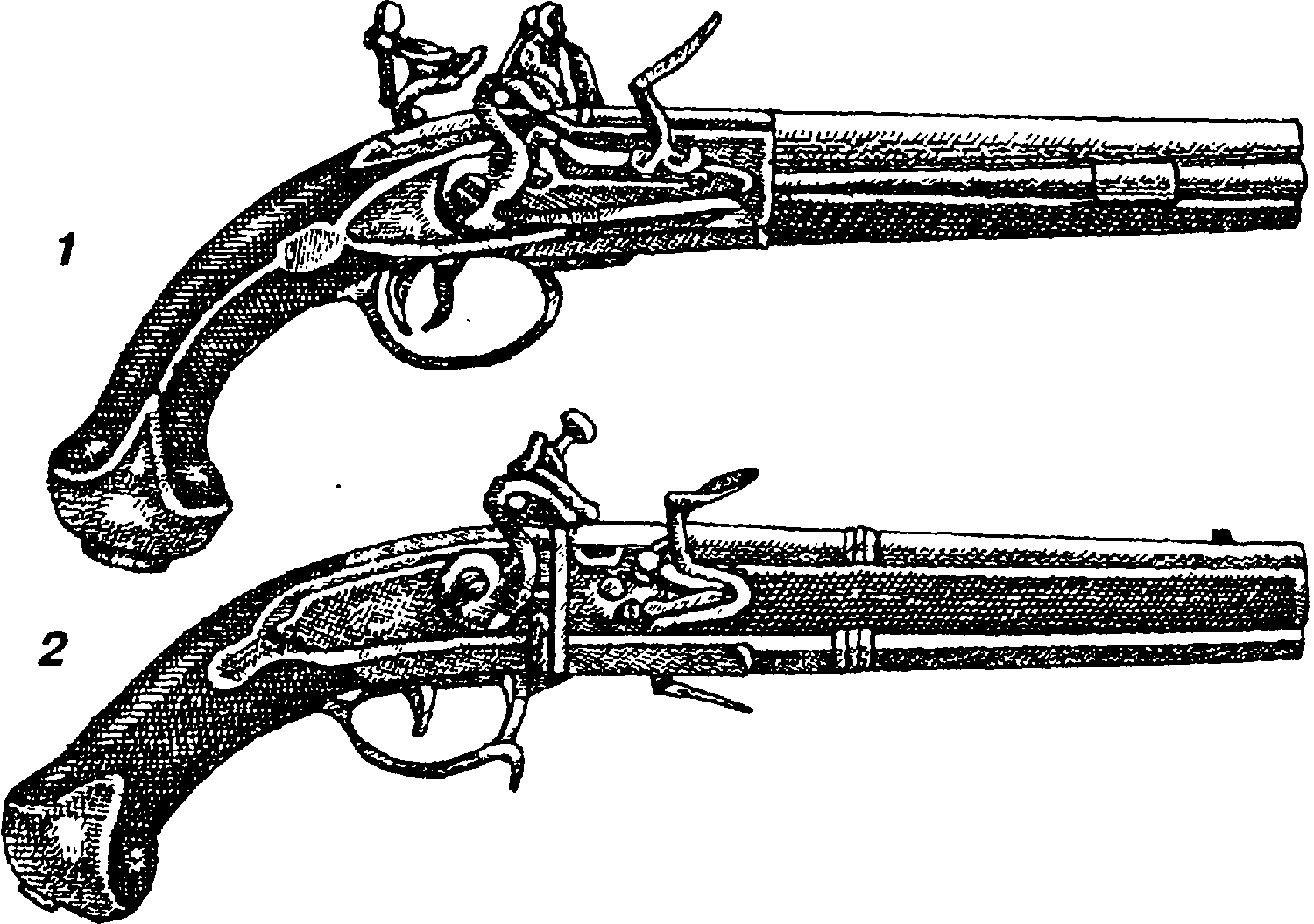 Скорострельные пистолеты, заряжаемые с дула. 1. Кремневый пистолет со стволами один над другим. 2. Один курок, два ствола, поворачиваемых рукой.