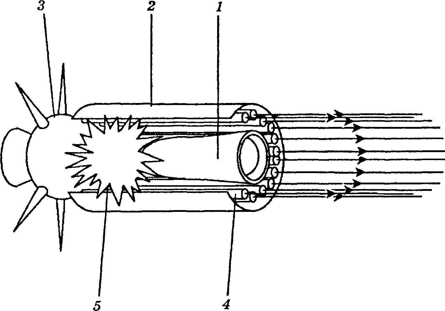 Схема рентгеновского лазера: 1 – следящий телескоп; 2 – кожух; 3 – система наведения и двигательная установка; 4 – лазерные стержни; 5 – ядерная бомба