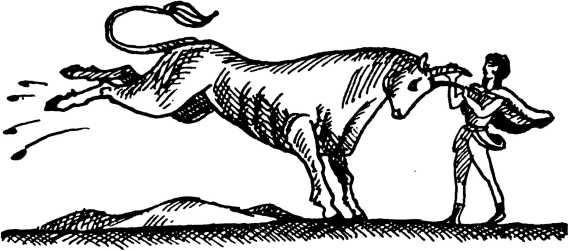 Вот мчится во весь опор могучий бык. Голова его опущена, а на нем, обеими руками ухватившись за рога, повисла девушка с черными локонами…