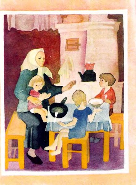 — У кого было, тот и принёс. У кого нету — в другой раз принесёт, — сказала старушка и вытащила из печки громадную чёрную сковороду, накрытую белой эмалированной крышкой.