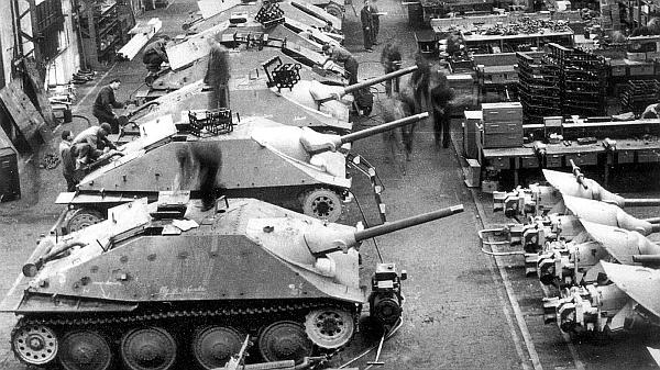 Сборка серийных САУ Jagdpanzer 38 Hetzer в цеху завода фирмы ВММ. 19 июня 1944 года