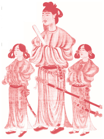 Принц Сётоку (в центре), изображенный с двумя сыновьями