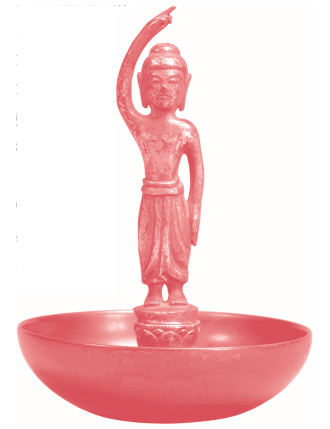 Исторический Будда Шакьямуни (Сяка) изображен в момент рождения, но уже обладающим физическими признаками просветленности. Эта фигура — часть чаши для ритуальных омовений