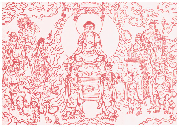 Шакьямуни произносит знаменитую проповедь в Оленьем парке в Бенаресе. Его окружают бодхисаттвы, дэвы и смертные люди