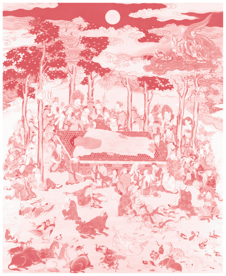 Паранирвана, или Смерть Будды: Шакьямуни лежит на настиле, вокруг него скорбящие боги, люди и животные, а его мать Майя летит по небу, чтобы принять его душу