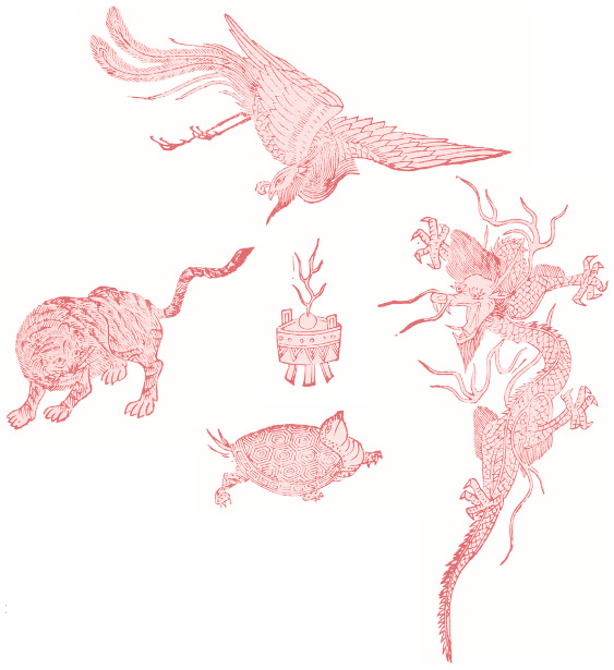 Четыре небесных божества: Черный воин севера (Гэмбу, внизу), Белый тигр запада (Бякко, слева), Красная птица юга (Судзаку, вверху) и Синий дракон востока (Сэйрю, справа). Для европейца любопытно, что север и юг расположены в непривычном обратном порядке