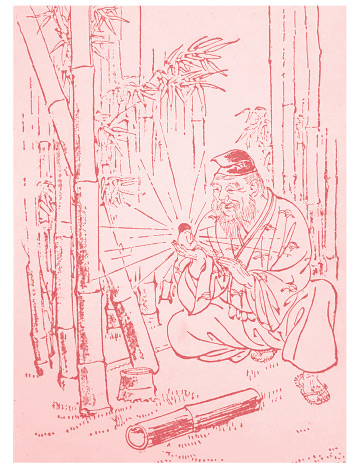 Старик рубит бамбук и находит внутри побега младенца-девочку Кагуя-химэ. Иллюстрация к началу «Сказки о резчике бамбука»
