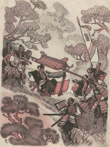 Перед самым полуднем барсук вышел на лесную дорогу и стал осматриваться. Вдруг он увидел, что по дороге какие-то люди несут паланкин. В паланкине сидел сам даймио и обмахивался веером.