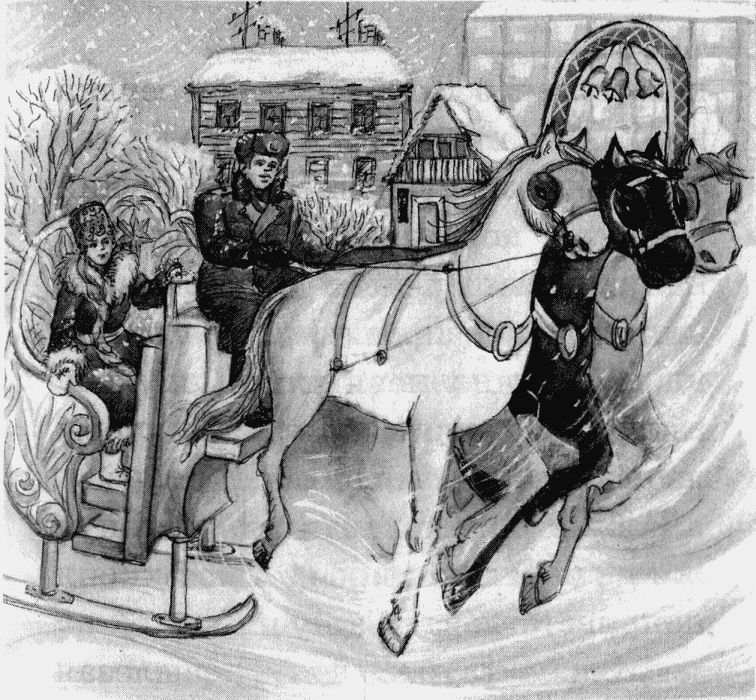 Завидев хрустальные сани, а в них Снегурочку и незнакомого лейтенанта, Даша Суворова бросилась навстречу удалой тройке. Вслед за ней побежал и Джек. Сашке Лопухову пришлось бежать за щенком, чтобы он ненароком не испугал лошадей.